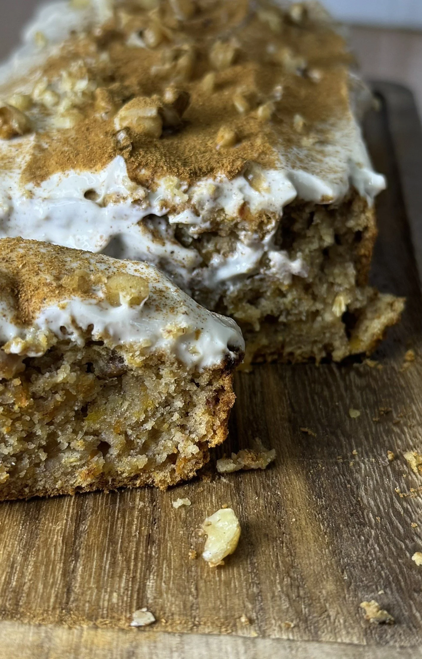 5.) Μόλις κρυώσει καλά το cake, απλώνουμε είτε το γιαούρτι είτε την πουτίγκα και βάζουμε από πάνω τα υπόλοιπα καρύδια και κανέλα.