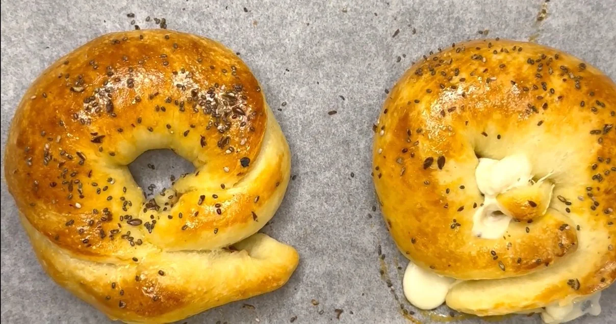 2.) Γεμίζουμε με 1 κ.σ Philadelphia Light και 25 γρ. σολομό το κάθε κομμάτι και τυλίγουμε προσεχτικά δίνοντας το σχήμα το Bagel
